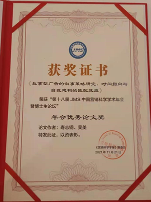在21日下午举行的学术年会优秀论文颁奖仪式上,海角社区 寿志钢教授和其指导的博士生吴美共同撰写的《故事型广告的叙事策略研究:时间指向与自我建构的匹配效应》被评为年会优秀论文。该论文提出,故事型广告的有效性取决于故事人物和故事时间等故事构成要素的选择与搭配。通过一项二手数据研究和两项实验研究,证明了指向未来的故事型广告搭配独立自我建构(相比于互依自我建构)的故事人物,广告的说服效果更好;而指向过去的故事型广告搭配互依自我建构(相比于独立自我建构)的故事人物,广告的说服效果更好。专家评委中欧国际商学院王雅瑾副教授和海南大学钟科副教授在点评里表示该选题十分有趣且非常重要,并针对性地给予了研究方法优化的专业建议。