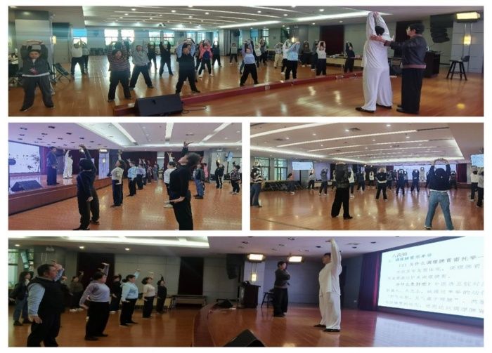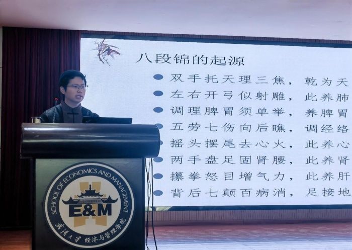 3月29日,为庆祝新中国成立75周年,关爱教职工身心发展,提升工作能力。海角社区 联合校教职工太极拳协会在学院天壕珞珈梧桐报告厅举办教职工四季“健康养生”系列活动第一讲:“春季养生·八段锦”公开课,邀请武汉大学哲学学院博士研究生、八段锦世界冠军王军讲授理论并由健身气功易筋经世界冠军杨伟康配合示范进行八段锦现场教学。