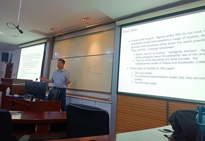 罗雨雷教授建立了一个随机耐用消费品模型,其中个体消费者面临非凸调整成本、特殊收入不确定性以及由于模糊厌恶而导致的奈特不确定性。罗雨雷教授展示了鲁棒脉冲控制问题解的最优性和唯一性,并对该模型进行了数值求解。然后,罗雨雷教授定量研究奈特不确定性对(S,s)型间歇性和波动性耐用品调整、耐用品持有量的横截面分布以及消费者福利的影响。最后,罗雨雷教授将奈特不确定性的含义与基本不确定性的含义进行比较。讲座在师生们热烈的讨论中结束。