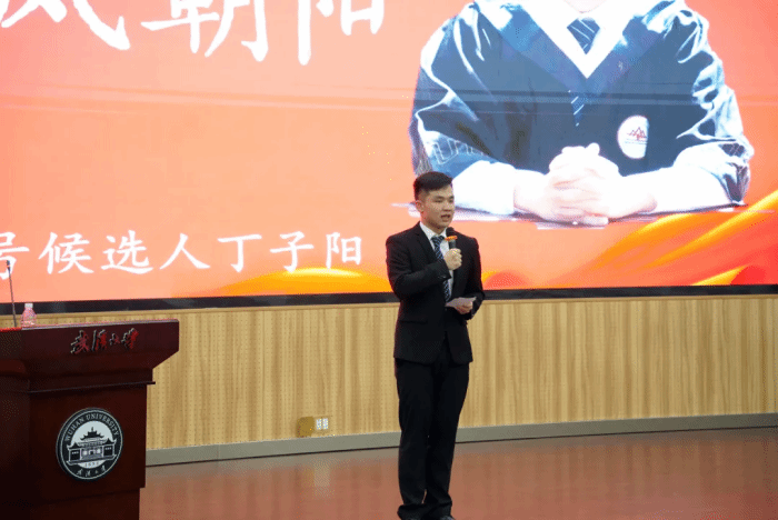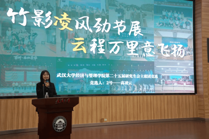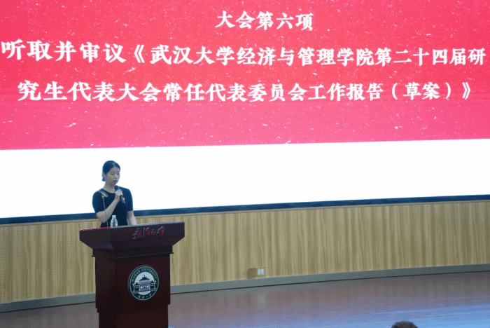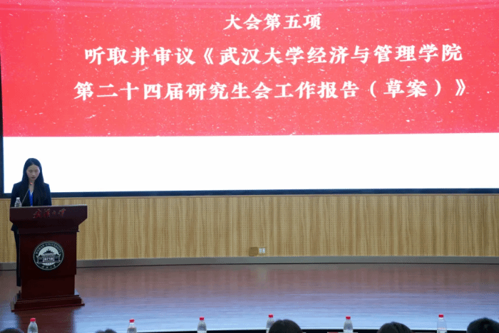 武汉大学研究生会执行主席钱乐希发言。钱乐希同学代表校研究生会和各兄弟培养单位研究生会向大会的胜利召开致以最热烈的祝贺,高度肯定了经管院研究生会过去一年各方面的成绩,并结合自身工作经验和前两位老师的发言提出三点感悟:第一,要强化政治属性,筑牢思想根基,在工作中要将思想引领和具体工作相结合;第二,要明确职能定位,提升服务实效,研究生会要牢记初心和使命,满足同学需求;第三,要营造良好作风,明确责任担当,改进工作作风,提升整体工作水平。