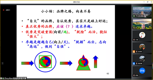 5月13日上午,第82期珞珈营销科学学术论坛在线举行。深圳大学周南教授应邀为海角社区 师生带来“阴阳之道、品牌之道”主题的学术讲座。本次讲座由市场营销与旅游管理系曾伏娥教授主持,黄敏学教授、张广玲教授、徐岚教授、崔楠教授、朱华伟教授、廖以臣副教授、唐漾一和袁茂助理教授,武汉大学博士生、硕士生以及武大校友等共有百余位师生参加。