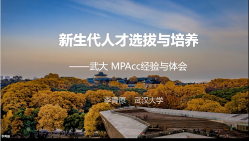 李青原以《新生代人才选拔与培养——武大MPAcc经验与体会》为题,从新生代MPAcc展现出的年龄、结构、职业、学业背景等新特点出发,强调从四个维度提升人才选拔与培养质量。一是建立项目特色、提升生源质量,以悠久的办学历史和坚实的办学基础形成项目吸引力;二是加强行动创新、提升培养质量,将“立德树人”思想贯穿于教学与实践全程;三是坚持质量标准、提升学位质量,通过强化导师责任,把控质量出口;四是围绕育人主线、提升品牌质量,以专业组织专项活动、丰富专业内涵。演讲中,李青原强调高校之间要加强交流与协作,共同进步,为党为国培养更多适应新时代发展的高层次应用型会计人才。