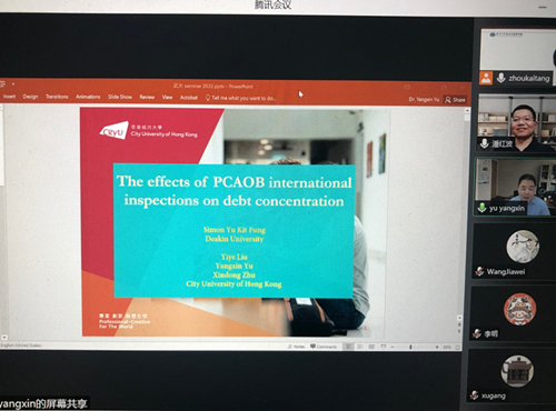 会议前半程,余扬新教授进行了论文的分享,从研究问题、研究动机、文献回顾、假设发展、实证结果和研究结论等部分展开,重点阐述了文章的研究动机和利用PCAOB国际检查这一setting的优势,基于协调成本(coordination costs)视角对PCAOB国际检查与债务集中度之间的关系进行了理论分析,最后利用跨国数据进行了实证检验。