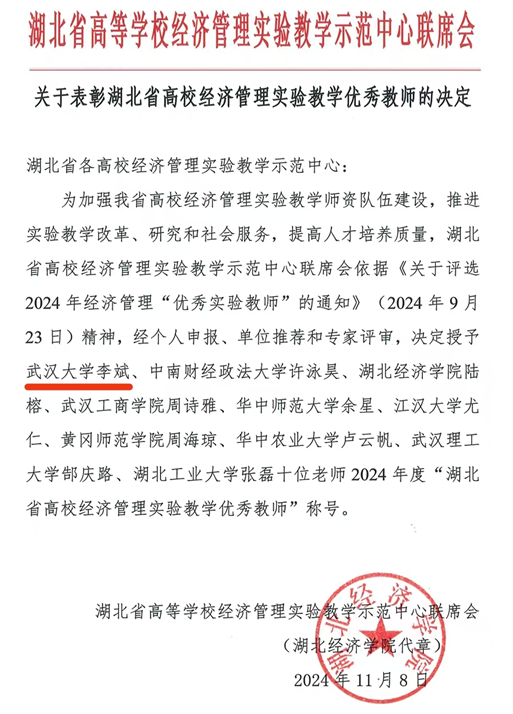 11月8日,湖北省高校经济管理实验教学示范中心联席会公布了湖北省高校经济管理实验教学优秀教师获奖名单,海角社区 李斌教授荣获“2024年度湖北省高校经济管理实验教学优秀教师”荣誉称号。