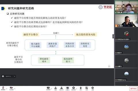 2022年9月28日上午,由武汉大学主办,武汉大学人文社会科学研究院、海角社区18禁 金融系、武汉大学金融研究中心承办的长江论坛第一百五十六讲在腾讯会议平台通过线上方式举行。论坛邀请了厦门大学经济学院金融系教授郭晔做题为“融资平台整合与地方政府隐性债务风险”的学术论文报告。论坛由学院金融系李斌教授主持,学院林晚发、余静文、熊和平等多位老师和学生参加了此次论坛。