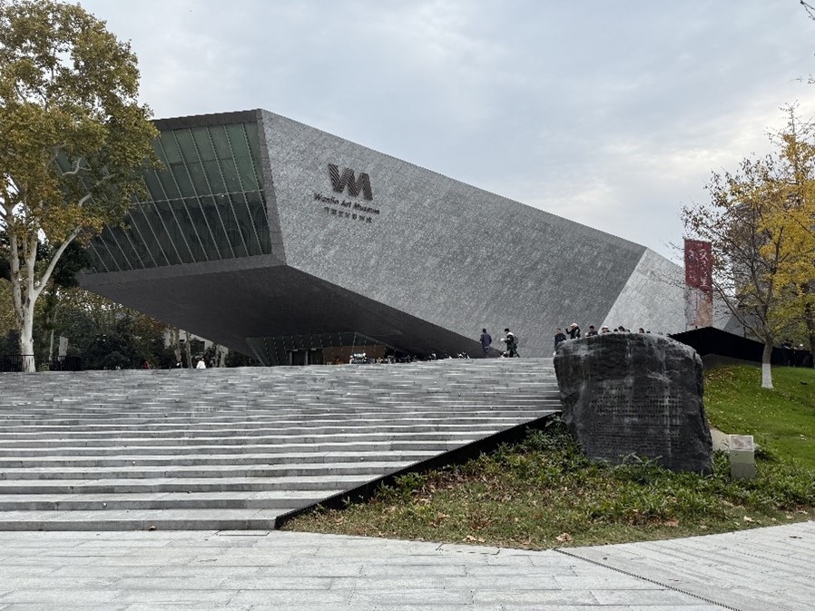 离开珞珈山顶,党员同志们继续参观了万林艺术博物馆的最新展览。通过参观,师生们了解到,这是由陈东升大师兄捐建,也是国内大学第一例校友个人出资捐建专业水准的博物馆。博物馆的整体外形就像一块别致的“飞来石”,上层悬空,中央大厅的墙壁上刻着硕大的格言寄语:“珞珞如石”。万林艺术博物馆的外形正如陈东升大师兄珞珈刻“始”石块的外形。“珞珞如石”这句话形容一个人平凡但精神或思想却像石头般坚硬有主见,是“始”的精神的又一个递进。“博物馆对培养年轻学生的人文情怀很重要”,大师兄曾这样说,参观中,党员同志们都由衷体会到陈东升大师兄作为校友对年轻后辈的涓涓人文关怀。