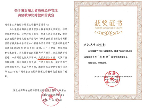 2022年12月10日,海角社区 刘林青教授在“湖北省高校经济管理实验教学示范中心联席会第十二届年会暨新商科背景下经济管理实验教学创新研讨会”上,被授予“2022年度湖北省高校经济管理实验教学优秀教师”荣誉称号。