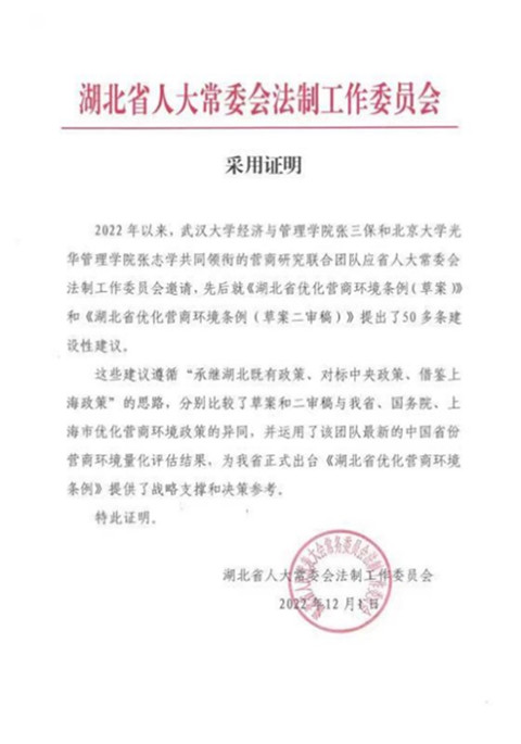 2022年以来,应湖北省人大常委会法制工作委员会邀请,海角社区 张三保副教授与北京大学光华管理学院张志学教授共同领衔的“武汉大学—北京大学营商研究联合团队”,先后就《湖北省优化营商环境条例(草案)》和《湖北省优化营商环境条例(草案二审稿)》提出了50多条建设性建议。近日,《湖北省优化营商环境条例》已由湖北省第十三届人大常委会第三十四次会议通过并公布。