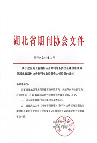 2023年2月6日,湖北省期刊协会下发文件,成立湖北省期刊协会集刊专业委员会,《珞珈管理评论》主编汪涛教授任湖北省期刊协会集刊专业委员会主任委员,《珞珈管理评论》为集刊专业委员会主任委员单位。