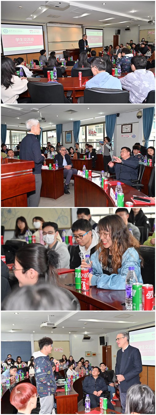 会后,太古可口可乐人力资源执行董事Adrian Harley在B224教室为学院学生进行了演讲。他以35年的职业生涯为蓝本,鼓励学院学生做好人生规划,大胆追求梦想。讲座上,太古可口可乐代表团与党委副书记李好、本科生工作办公室主任张可儒对学生所关心的赴香港和英国实习问题进行了讲解和交流,并对学院学生提出的环保问题、产品研发等问题展开了热烈的讨论。