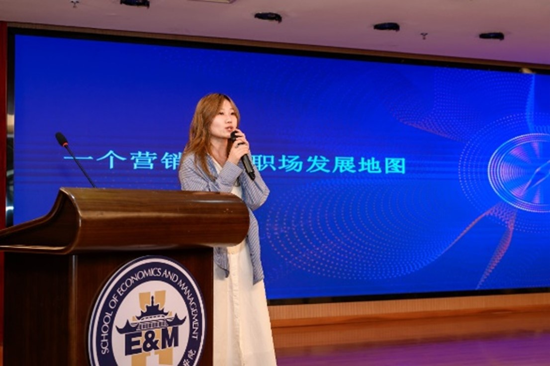 在随后的校友分享环节中,腾讯微信支付产品经理、武汉大学市场营销专业2020届硕士毕业生孟弦,以“一个营销人的职场发展地图”为题,带来了一场充满洞见的分享。她回顾了自己选择市场营销专业的初心,以及在咨询公司实习期间对营销价值的深刻体会。孟弦通过自己的亲身经历,从互联网保险到微信摇一摇公益项目,生动地展示了营销人在与用户实现有效沟通、在用户心智中占据一席之地的策略和技巧。