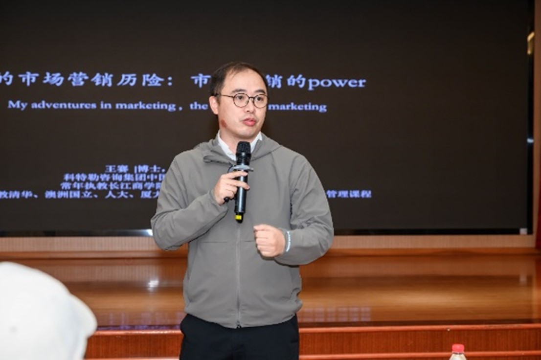 随后,科特勒咨询集团中国与新加坡区域执行董事、管理合伙人王赛博士为师生带来了题为“市场营销的‘power’:我的市场营销历险20年”的精彩分享。在二十年的职业生涯中,王赛博士不断探索市场营销的边界,通过平安银行、龙腾出行、隐秀高尔夫三个亲身经历的案例故事,让在场的师生们深刻体会到了市场营销的“power”。在演讲的最后,王赛博士发自内心地感慨到武汉大学珞珈王牌军市场营销系的价值,鼓励大家选择武大市场营销专业,以成为适应时代发展的营销人才。