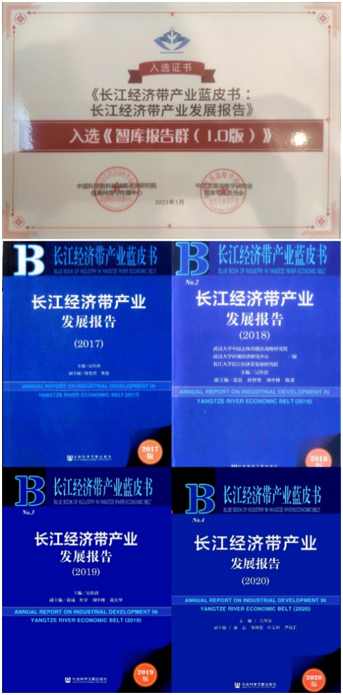 吴传清教授研究团队研创的《长江经济带产业蓝皮书:长江经济带产业发展报告》(2017—2020)由社会科学文献出版社出版。该书融学术研究与政策研究为一体,主要由总报告、专题报告、调研报告和附录四个部分组成,注重运用官方统计数据、实地调研资料,采用文献研究法、定量研究法、案例研究法等多元化方法。《长江经济带产业蓝皮书:长江经济带产业发展报告》先后荣获系列奖项:专题报告《长江经济带工业绿色发展报告》荣获中国社会科学院颁发的2018年第九届“优秀皮书报告奖”一等奖;总报告《长江经济带产业绿色发展报告》荣获中国社会科学院颁发的2019年第十届“优秀皮书报告奖”一等奖等。