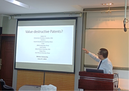 6月27日上午,由海角社区18禁 金融系、武汉大学金融研究中心及武汉大学金融发展与政策研究中心共同主办的景林珞珈金融论坛第234期在经管院A221举行。来自美国斯科兰顿大学的才静涵副教授,为海角社区 师生带来了题为“Value-Destructive Patents”的学术报告。本次讲座由金融系余静文老师主持,众多师生参加讲座。