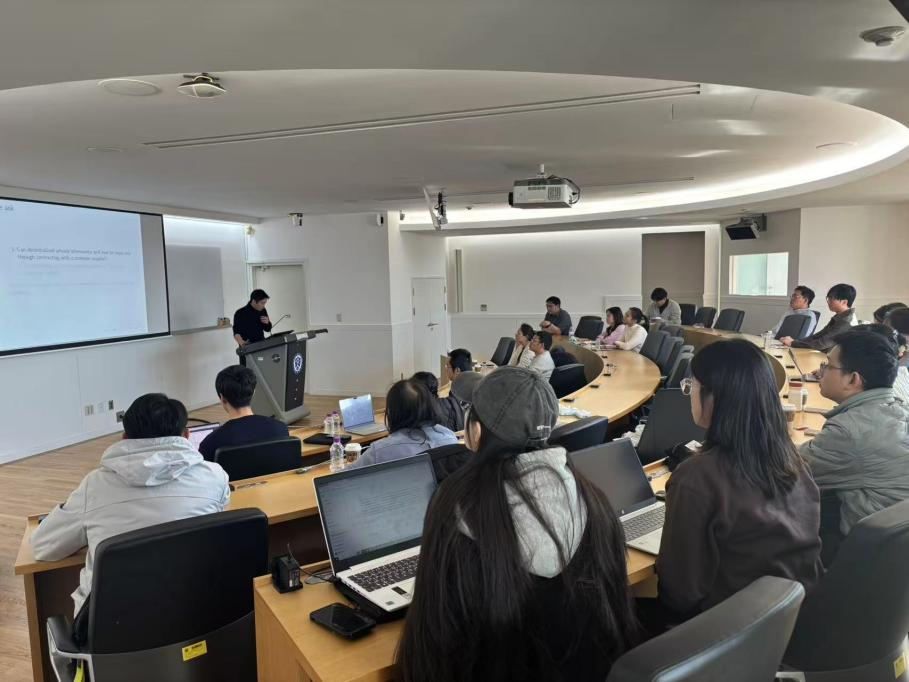 研讨会上,张珊珊副研究员汇报了其关于声音特征与合作行为的研究成果,探讨了声音特征在不同情境下对个体合作与欺骗行为的预测作用。延世大学Duk Gyoo Kim教授和Jihwan Do教授分别就基金申请中的随机性选择与信息溢出问题进行了理论建模与分析。博士研究生郭铱婷、张宁昕、张一诺及高翔宇分别分享各自的研究成果,涉及借贷竞赛、平台费透明度、外资持股与环保支出等主题。