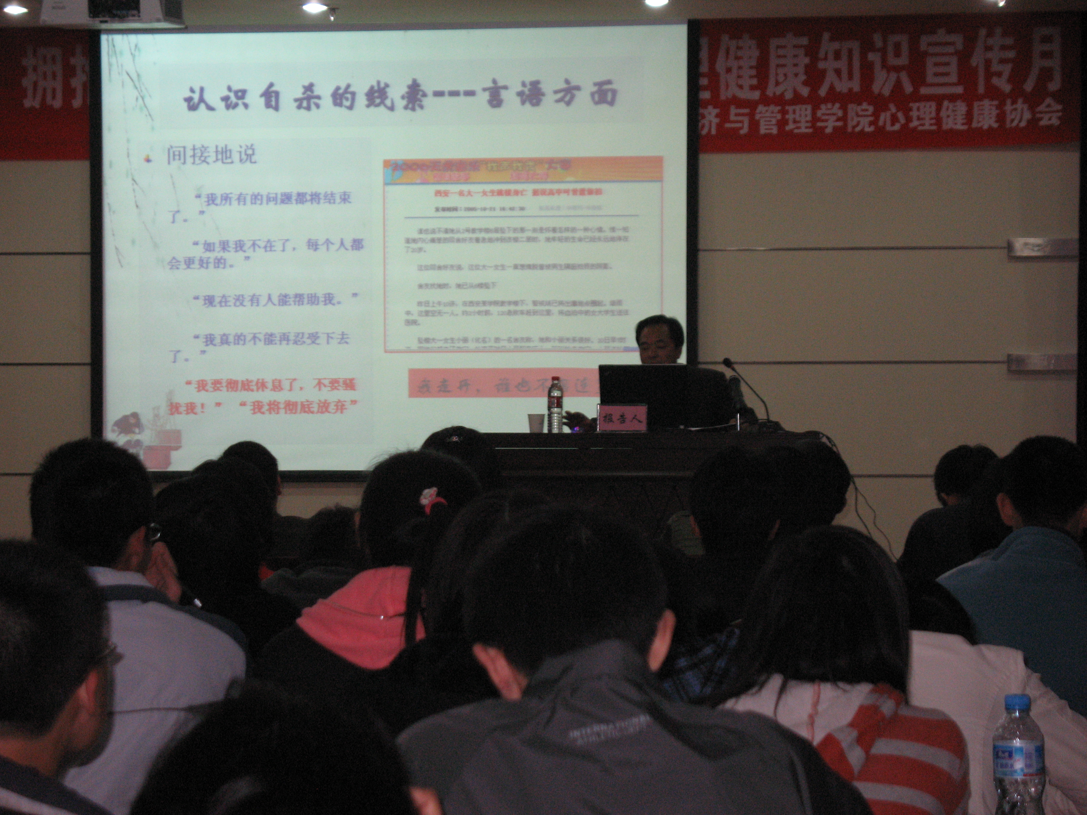 启动仪式结束后,赖海雄主任给广大学生干部做了题为“校园危机的识别与干预”的专题报告,细致讲解了校园心理危机尤其是自杀心理的识别方法和干预措施。 使广大学生干部能科学系统地掌握心理危机的识别方法和干预措施,能有效地运用到生活中给更多同学关爱和帮助。