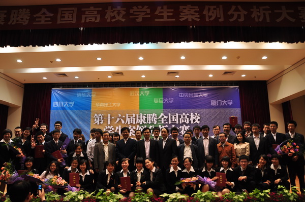 本届康腾全国高校学生案例分析大赛共收到来自全国30多所重点高校的250多支学生团队的参赛稿件。通过重重选拔,最终入围决赛的是来自清华大学、复旦大学、南开大学、山东大学、厦门大学、四川大学和武汉大学的八支代表队,他们中有“挑战杯”全国金奖获得者,也有即将前往美国耶鲁大学、斯坦福大学攻读硕士研究生的同学。全国高校精英的积极参与,使得本次大赛在专业水平上明显胜于其它同类高校赛事。当晚,来自这7所高校的8支学生团队经过3个小时的激烈角逐,最终来自四川大学的Lucky April团队斩获桂冠,与武汉大学的本草纲目团队共获一等奖。