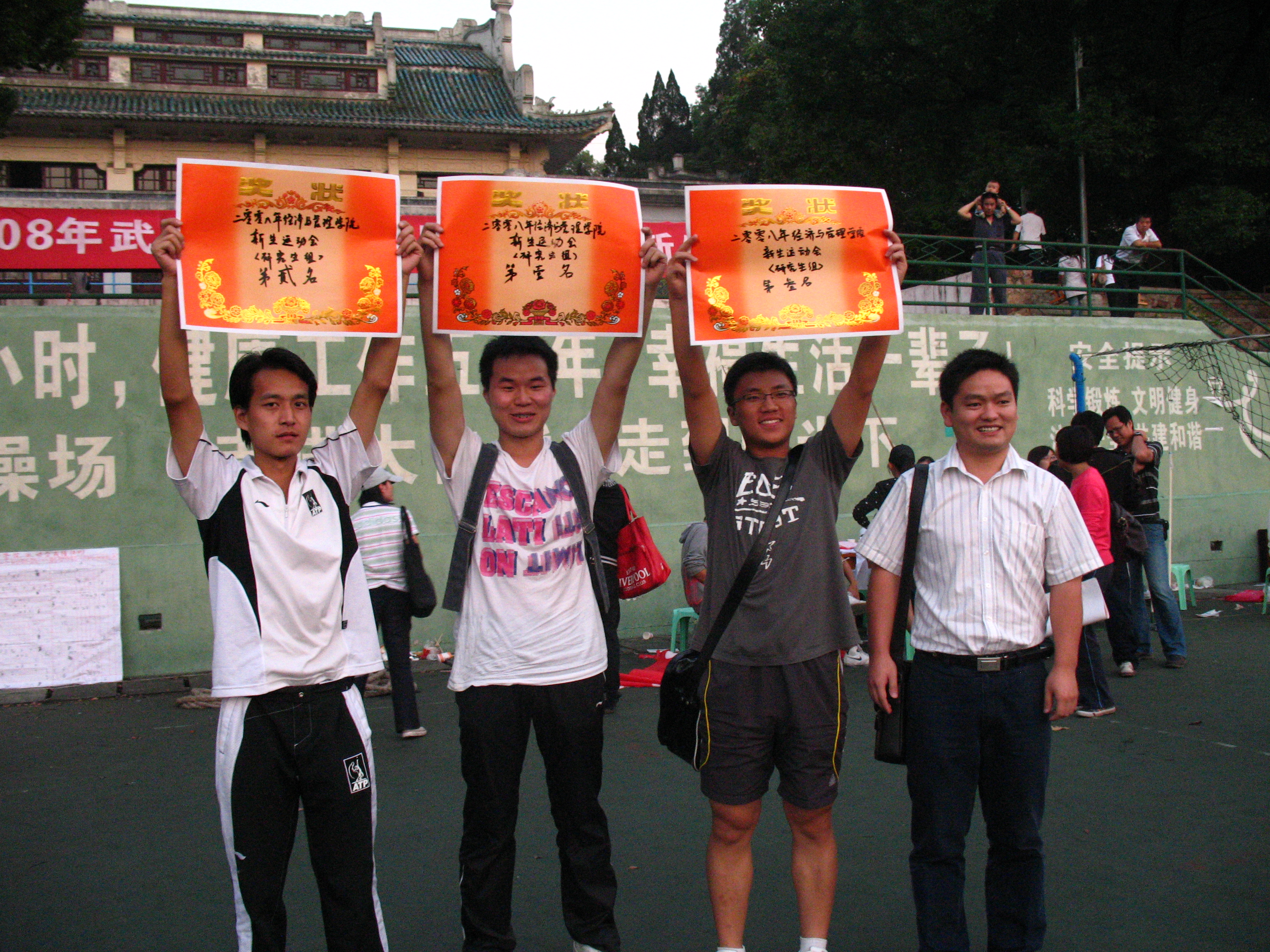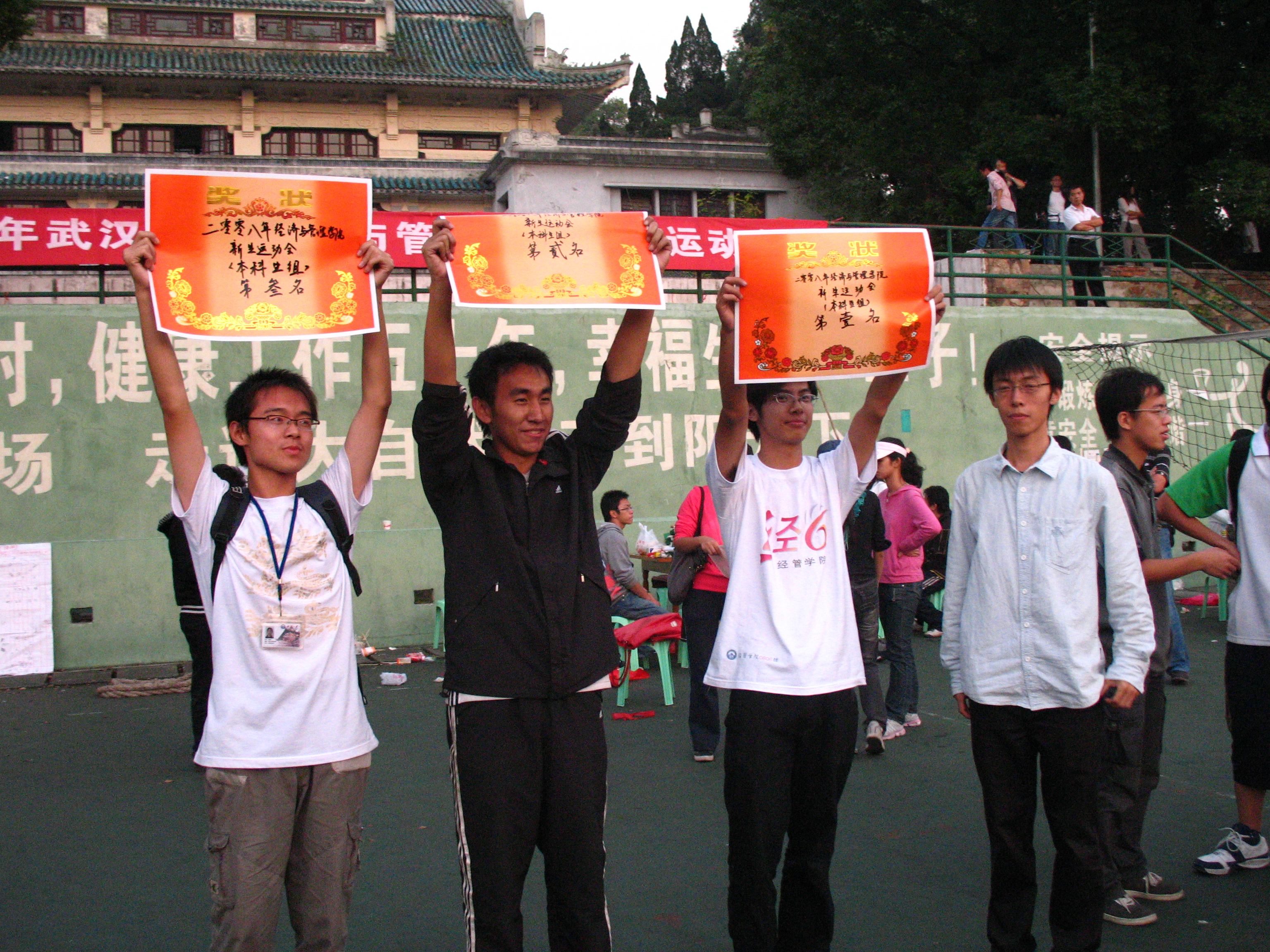经过激烈的角逐,本科组比赛由08级经济学类六班拔得头筹,经济学类八班和工商管理类五班分列二、三名;硕士组的冠军则被硕士六班夺走。最后,本次新生运动会总裁判长、武汉大学体育部余俊明老师宣布08年海角社区 新生运动会圆满结束。(学生工作办公室供稿)