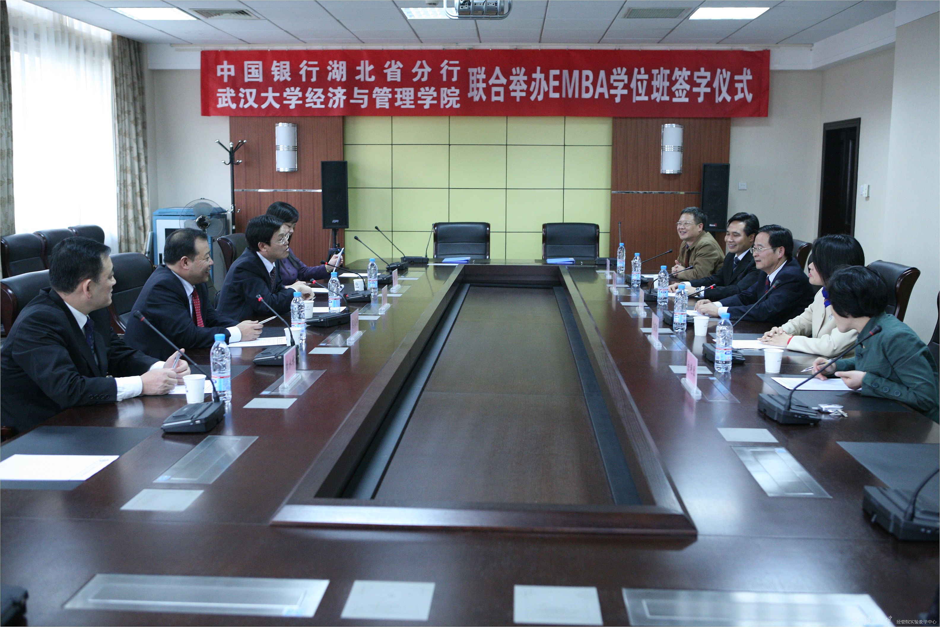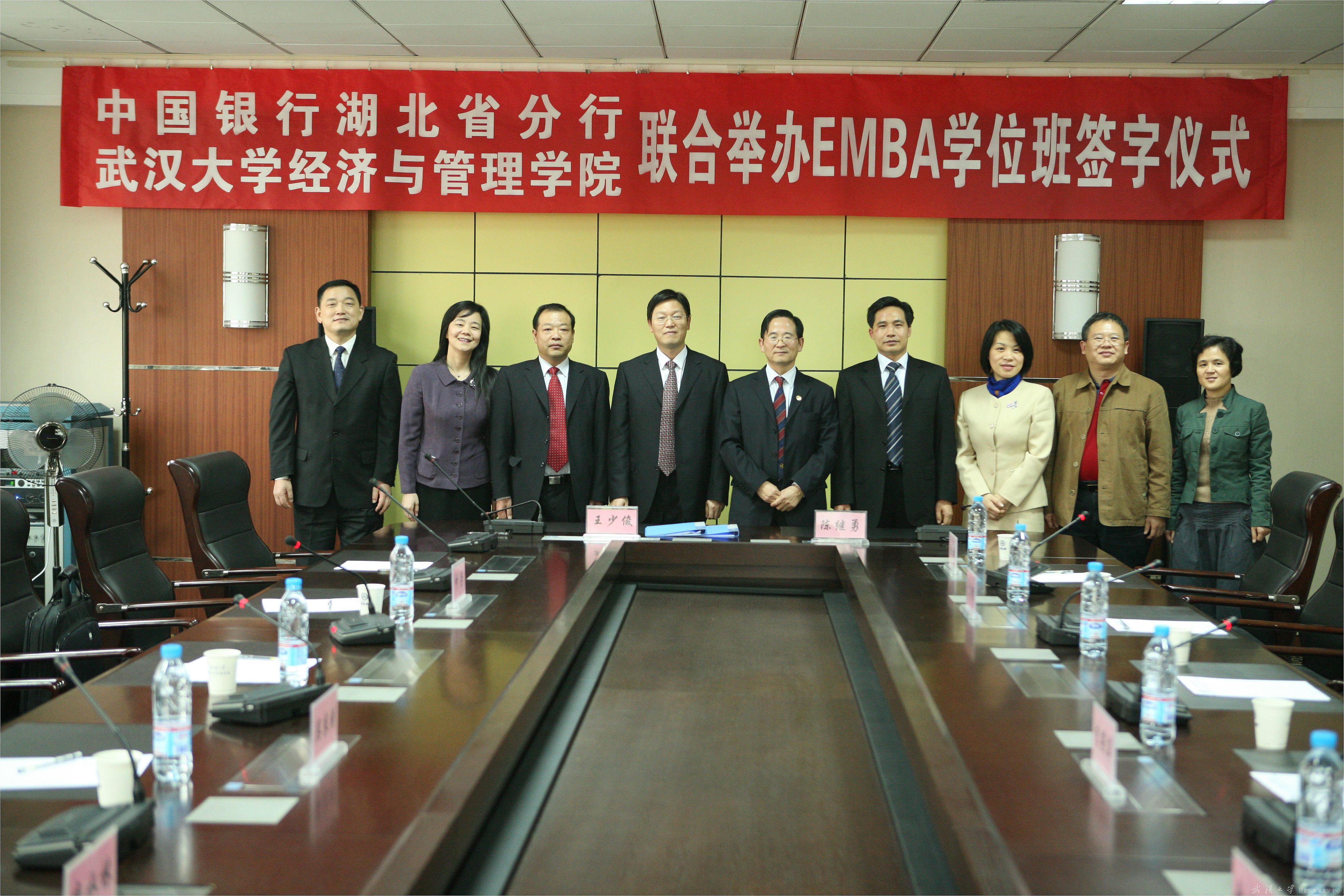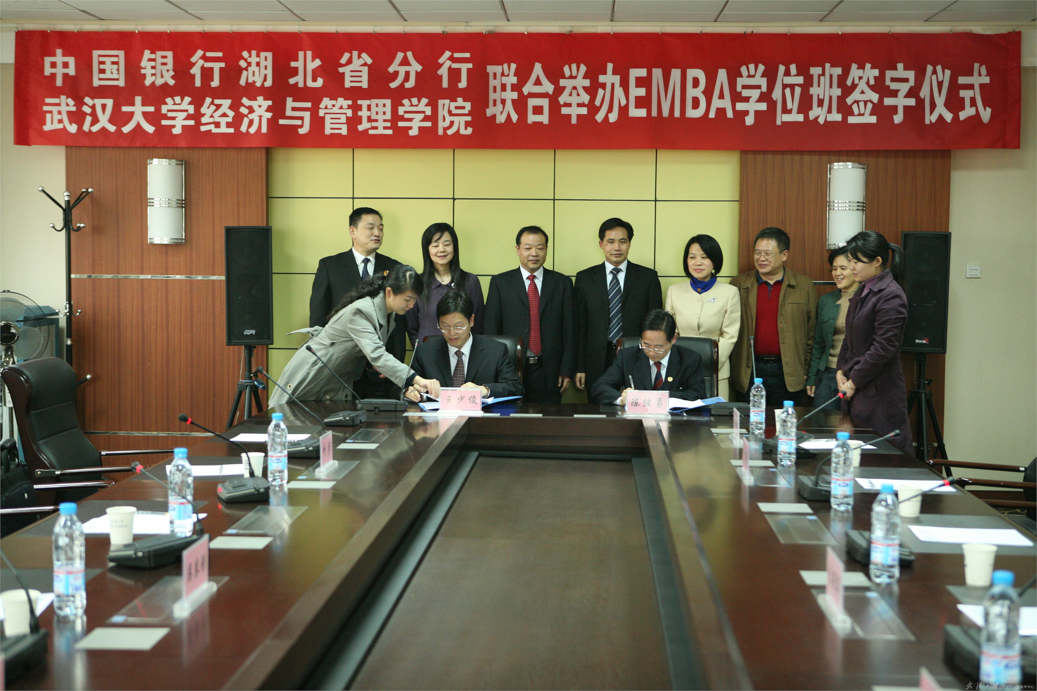 2007年11月8日下午,中国银行湖北省分行与海角社区 联合举办EMBA学位班合作协议签字仪式在学院第五会议室举行。中国银行湖北省分行行长王少俊、人力资源部总经理吴农刚、副总经理李水林、武汉东湖开发区支行行长叶芳,院长陈继勇、党委书记尤传明、常务副院长李燕萍、武汉大学EMBA教育中心办公室主任余艳琴、项目发展部主任陈林出席了签字仪式。
