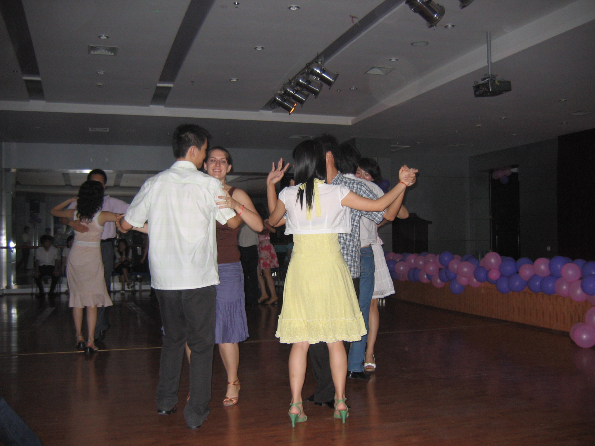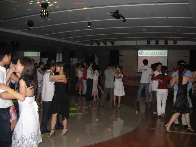 舞会由6对舞蹈培训时的学员跳的集体伦巴舞开场。虽然这些同学学舞的时间不长,但他们专著的表演和近乎专业的激情赢得了在场所有观众的热烈掌声。富有激情的开场舞带动了大家的情绪,随着音乐的不停切换,同学们纷纷在舞池里展现自己与平时在课堂上完全不同的一面,或风度翩翩,或激情四射,或如漫步小溪,或如迎风招展。舞会的最后,大家伴着明快的音乐跳起了集体恰恰,同学们手拉着手,用欢笑和明快的舞步将本次舞会推向高潮,同时也为此次舞会拉下了帷幕。