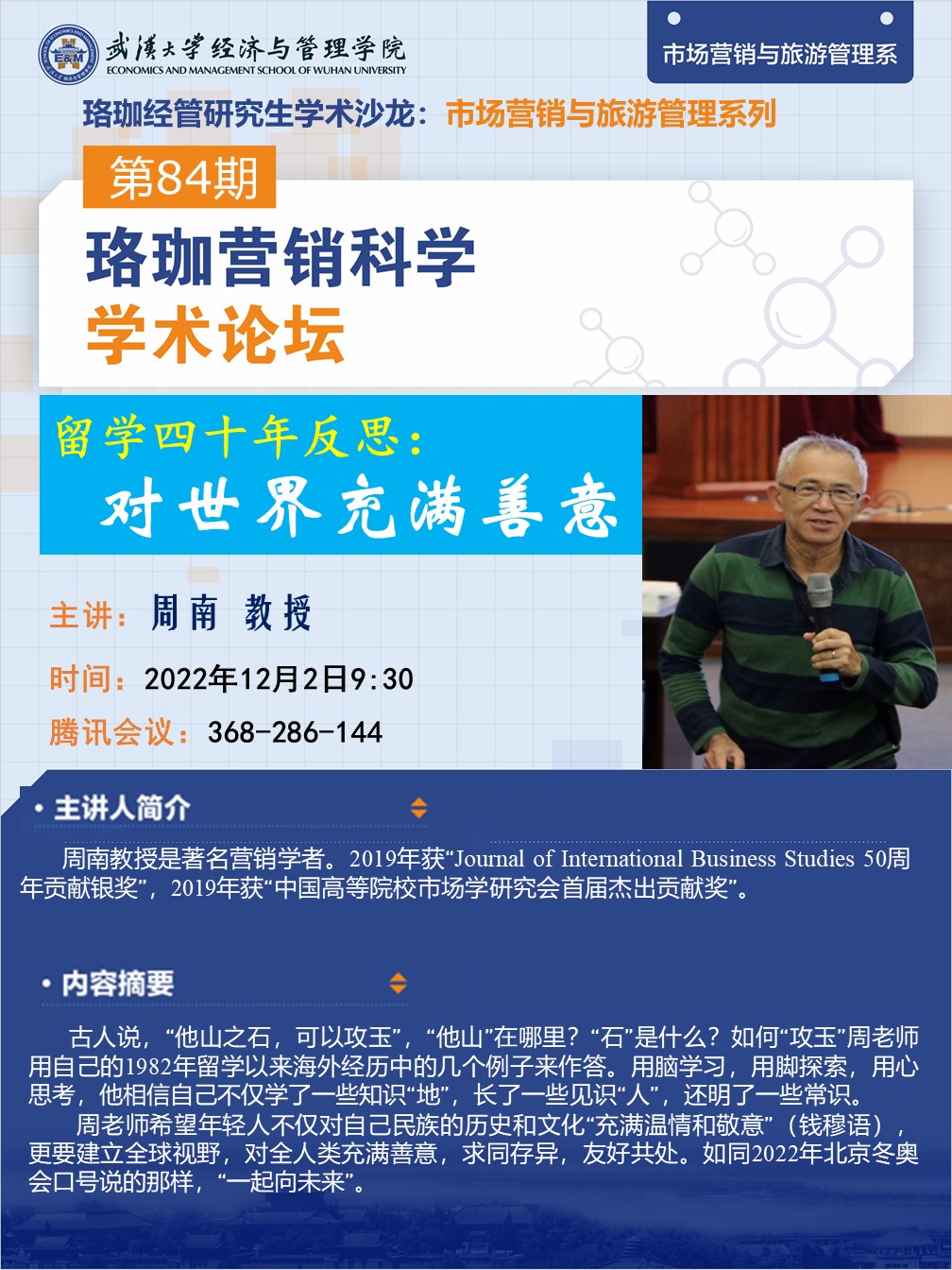 讲座人简介:周南教授是著名营销学者。2019年2月荣获“Journal of International Business Studies 50周年贡献银奖”,2019年获“中国高等院校市场学研究会杰出贡献奖。