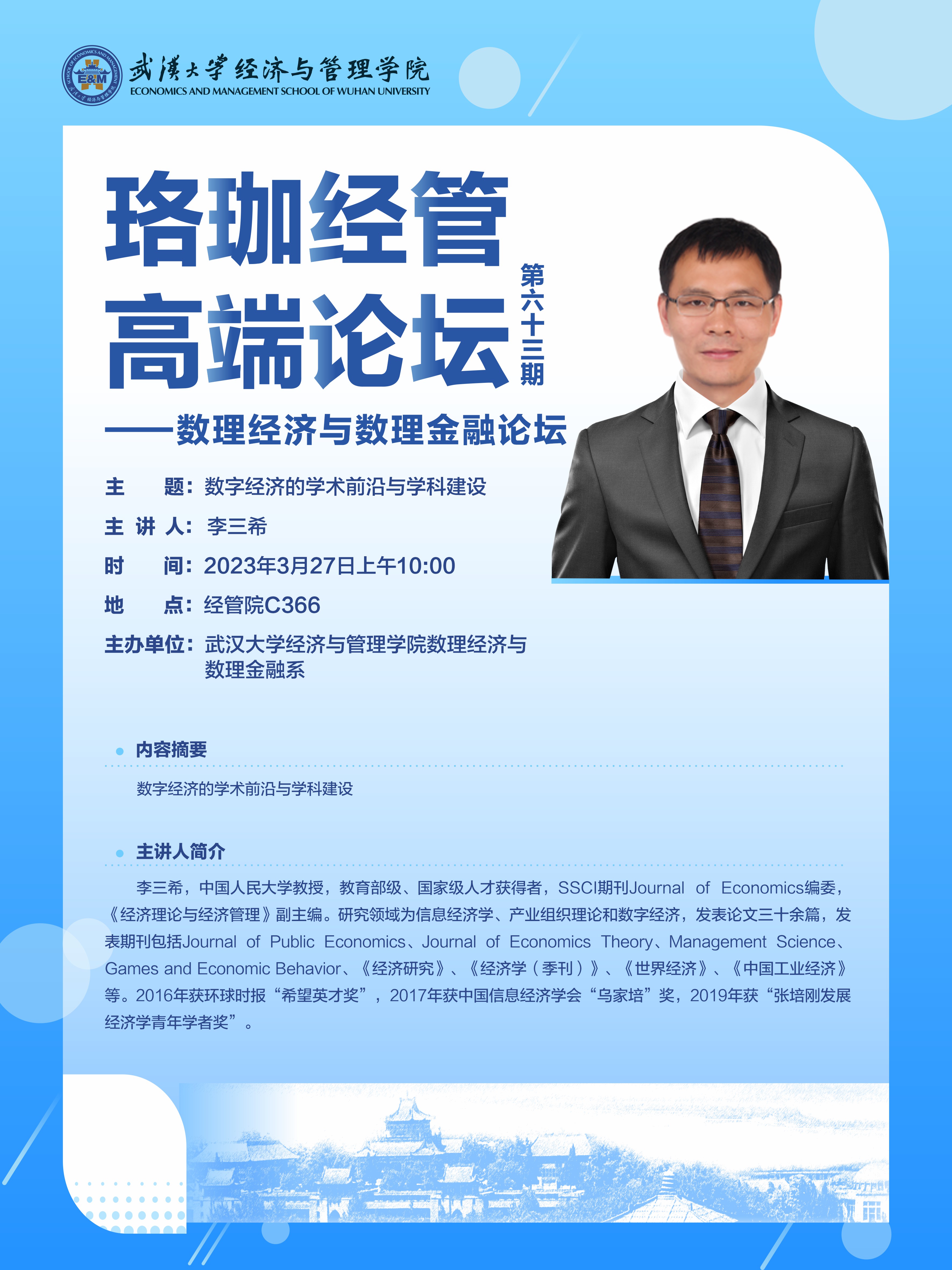 珞珈经管高端论坛第六十三期——数理经济与数理金融论坛
