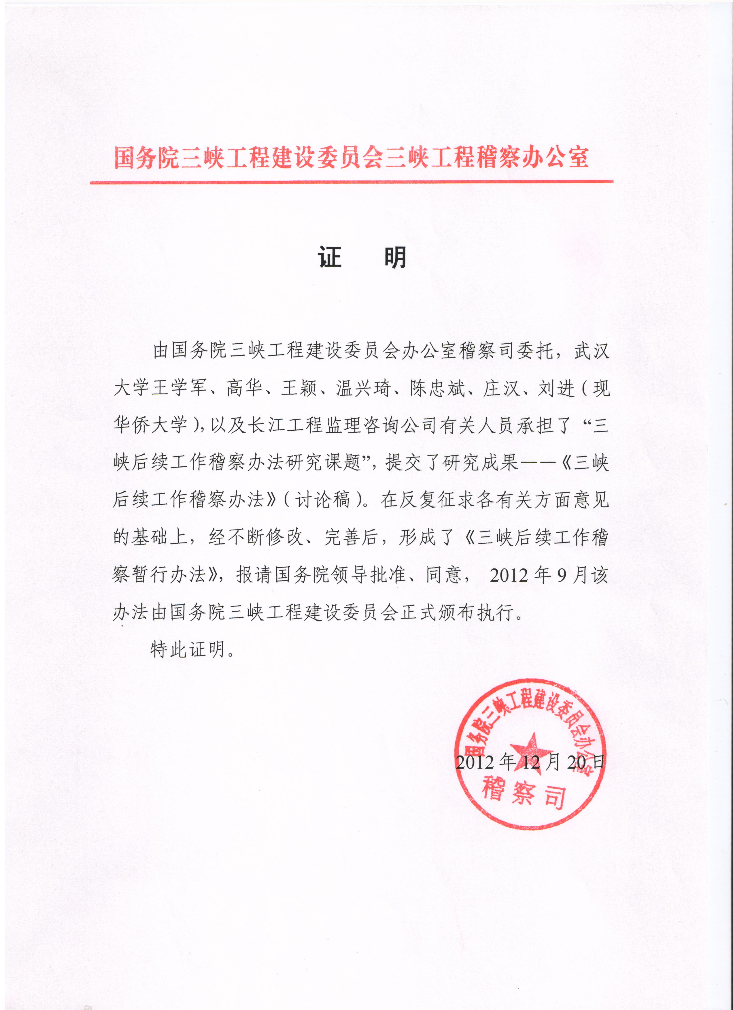 据悉,该项目是受国务院三峡工程建设委员会办公室稽查司委托,由王学军教授主持,高华、王颖、温兴琦、陈忠斌、庄汉、刘进(现华侨大学)等专家、学者合作,以及长江工程监理咨询公司共同承担的重大科研项目。项目开展以来,各项工作顺利进行,形成了《三峡后续工作稽察办法》(讨论稿)。在多次实地调研、反复征求各有关方面的意见的基础上,经不断修改、完善,形成了《三峡后续工作稽察暂行办法》,报请国务院领导批准同意,于2012年9月由国务院三峡工程建设委员会正式颁布执行。