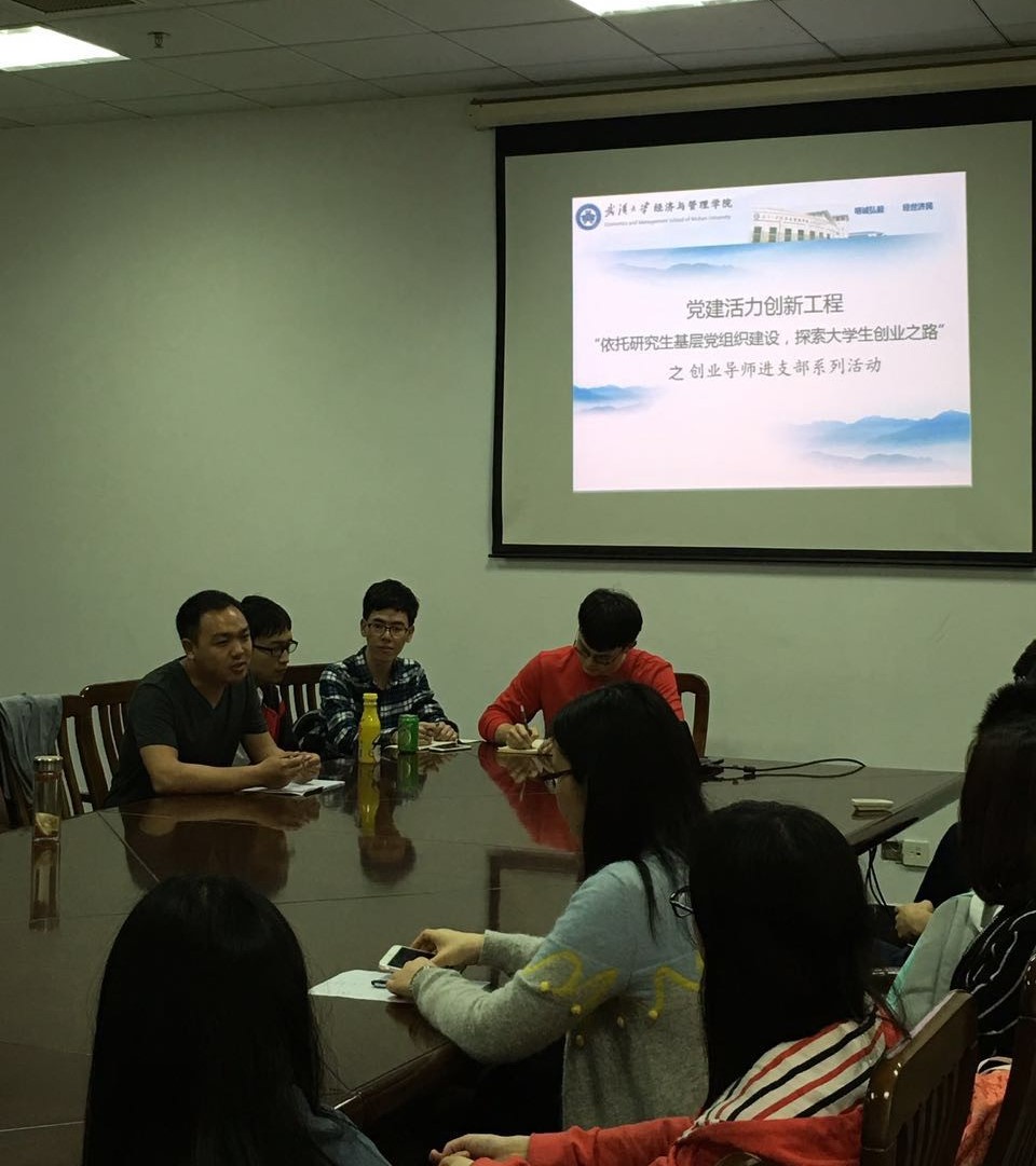 伴随着学院党建创新工程“依托研究生基层党组织建设,探索大学生创业之路”有条不紊的稳步开展,受到了同学们的一直好评,目前该系列活动已进入第四阶段——创业导师进支部。2016年4月26日中午12点半,2015级科硕一支部和科硕四支部的党员在学院第四会议室围绕“学习校园创业典型,营造支部创新氛围”举行了创业导师进支部主题党日活动,邀请到学返网创立者之一,来自水利水电学院博士二年级的李皓鑫学长做客海角社区