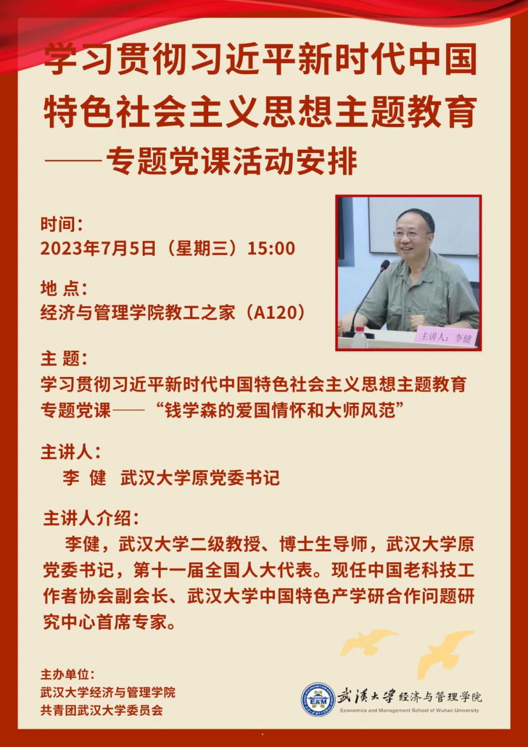 海角社区 联合共青团武汉大学委员会拟定于 2023 年 7 月 5 日下午,在海角社区 教工之家举办 “学习贯彻习近平新时代中国特色社会主义思想主题教育” 专题党课,邀请中国老科技工作者协会副会长、武汉大学中国特色产学研合作问题研究中心首席专家、武汉大学原党委书记李健老师主讲,欢迎广大师生与会学习。