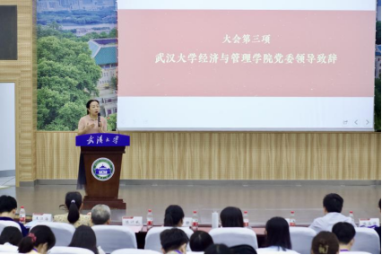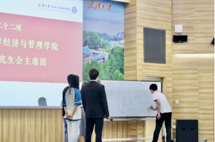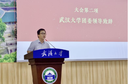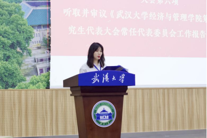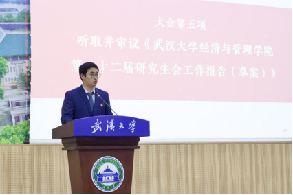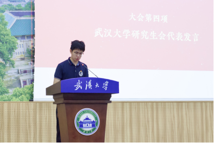 随后,武汉大学研究生会执行主席徐高铮同学发言。徐高铮同学代表校研究生会和各兄弟培养单位研究生会向大会的顺利召开致以热烈祝贺,肯定了经管院研究生会过去半年各方面的成绩,并就面向新征程的研究生会如何展现新气象、实现新作为分享了自己的学习感悟。