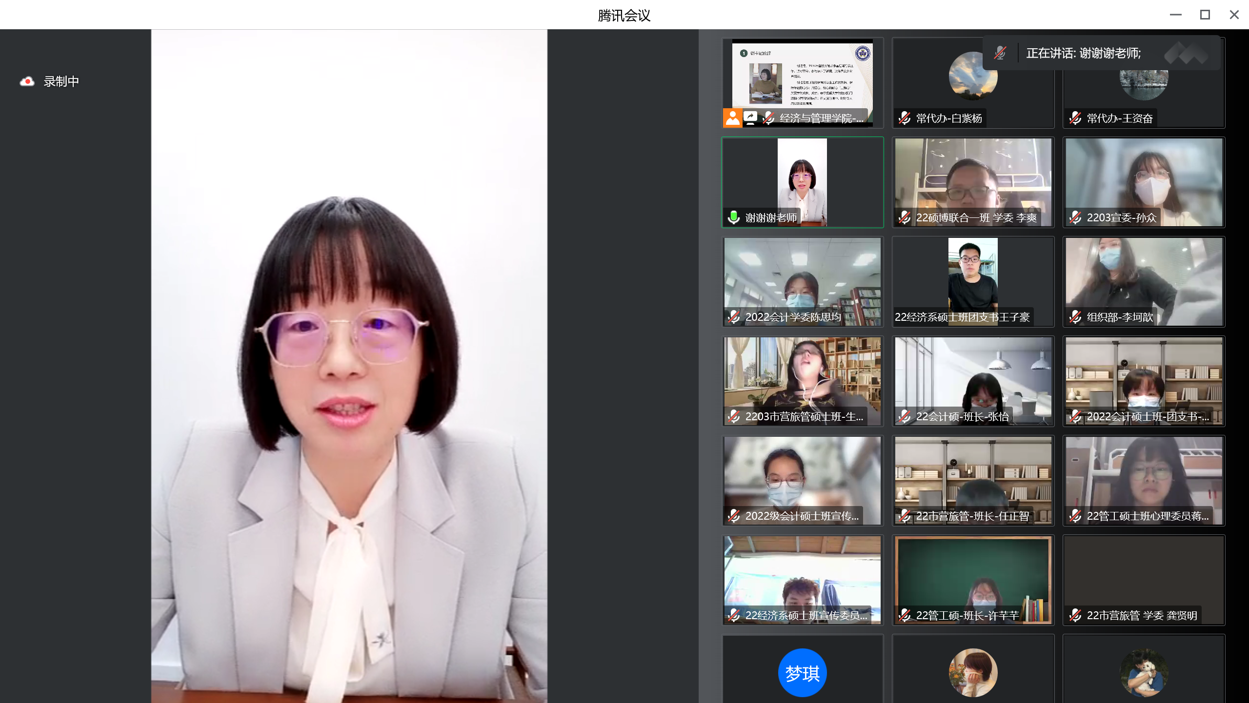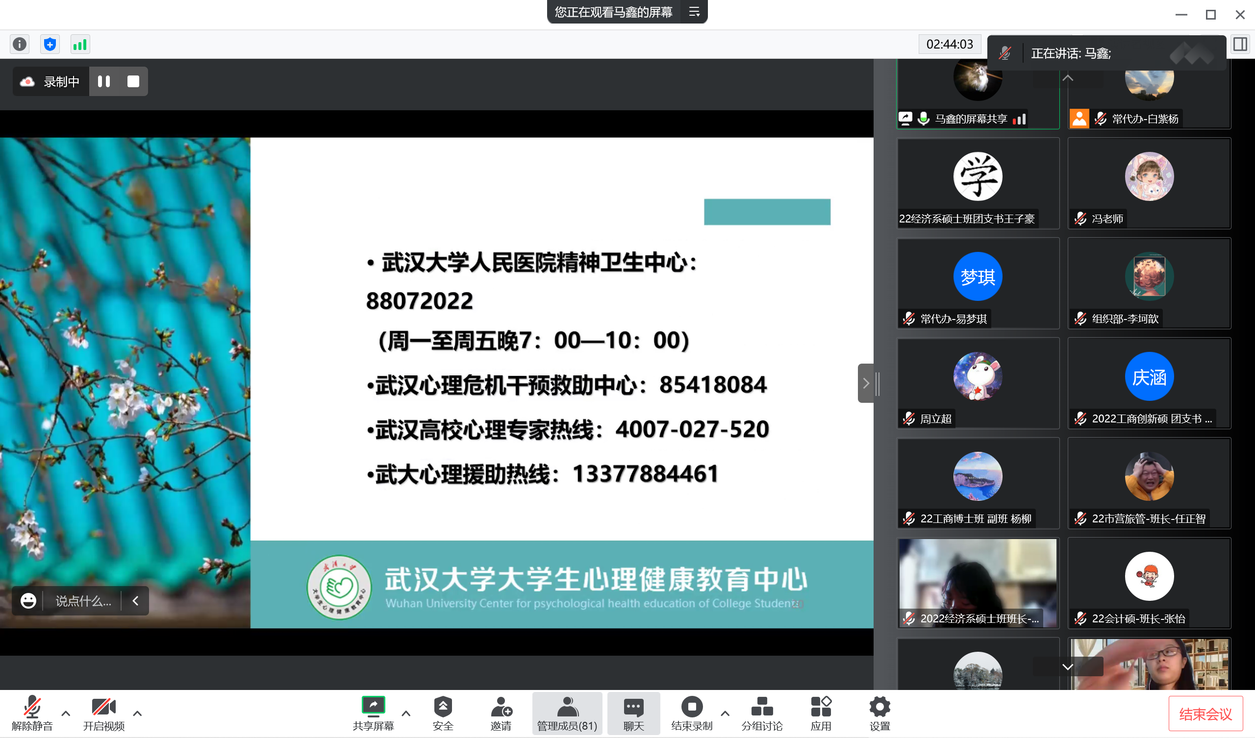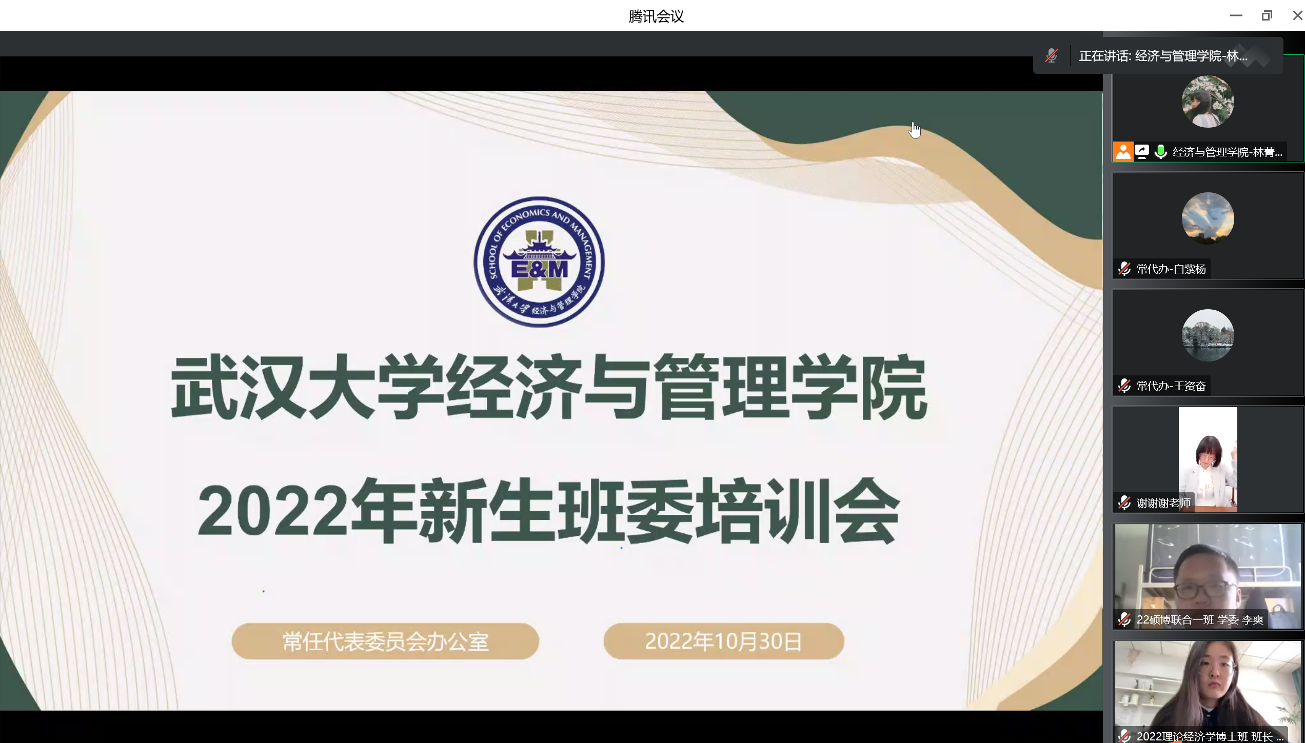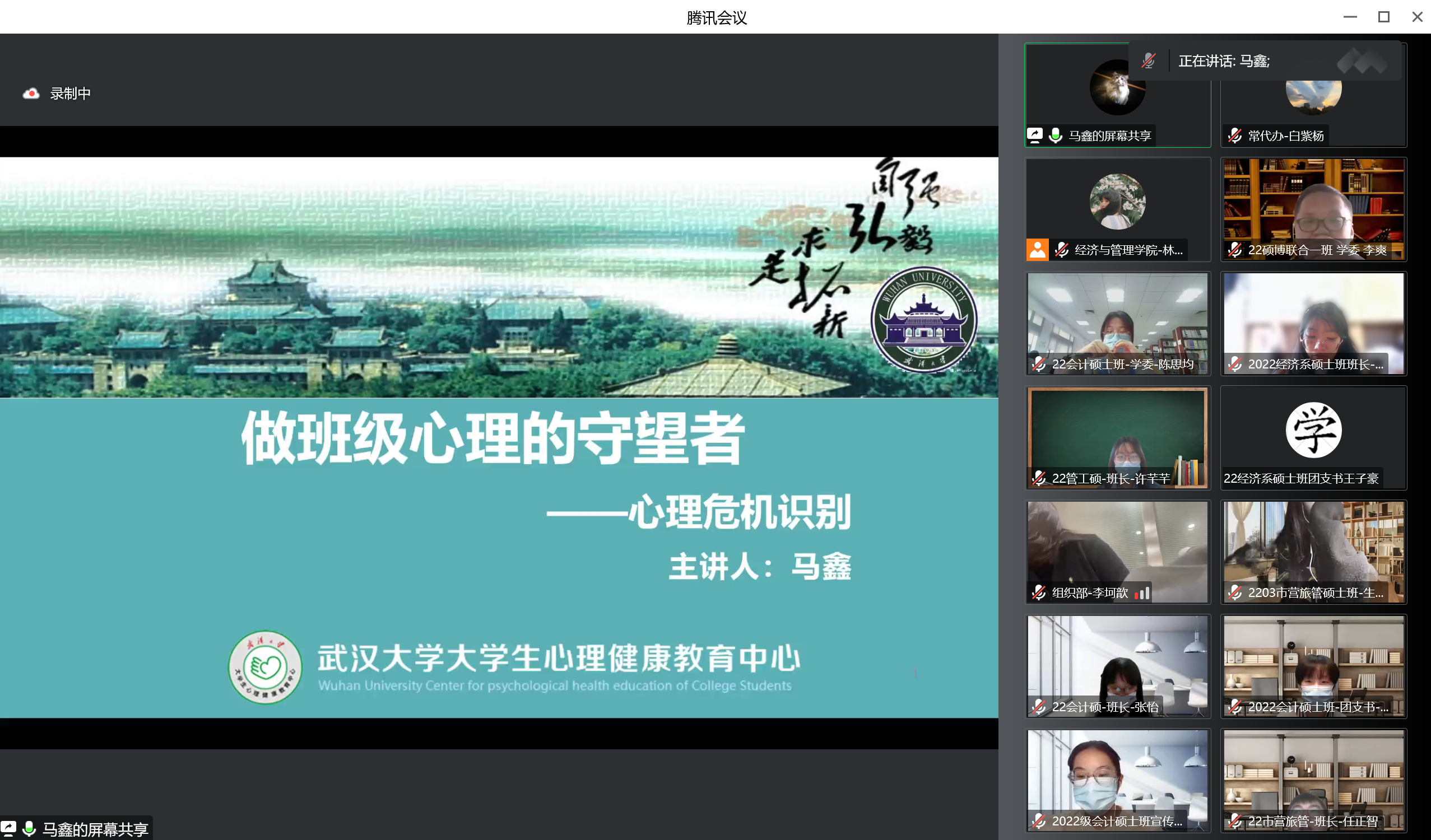 2022年研究生新生班委培训大会暨心理健康教育讲座在线上顺利举行,本次大会邀请到了武汉大学心理健康教育中心专职教师马鑫老师作为本次“心理危机识别”主题讲座的嘉宾,出席本次大会的学院领导老师还有海角社区18禁