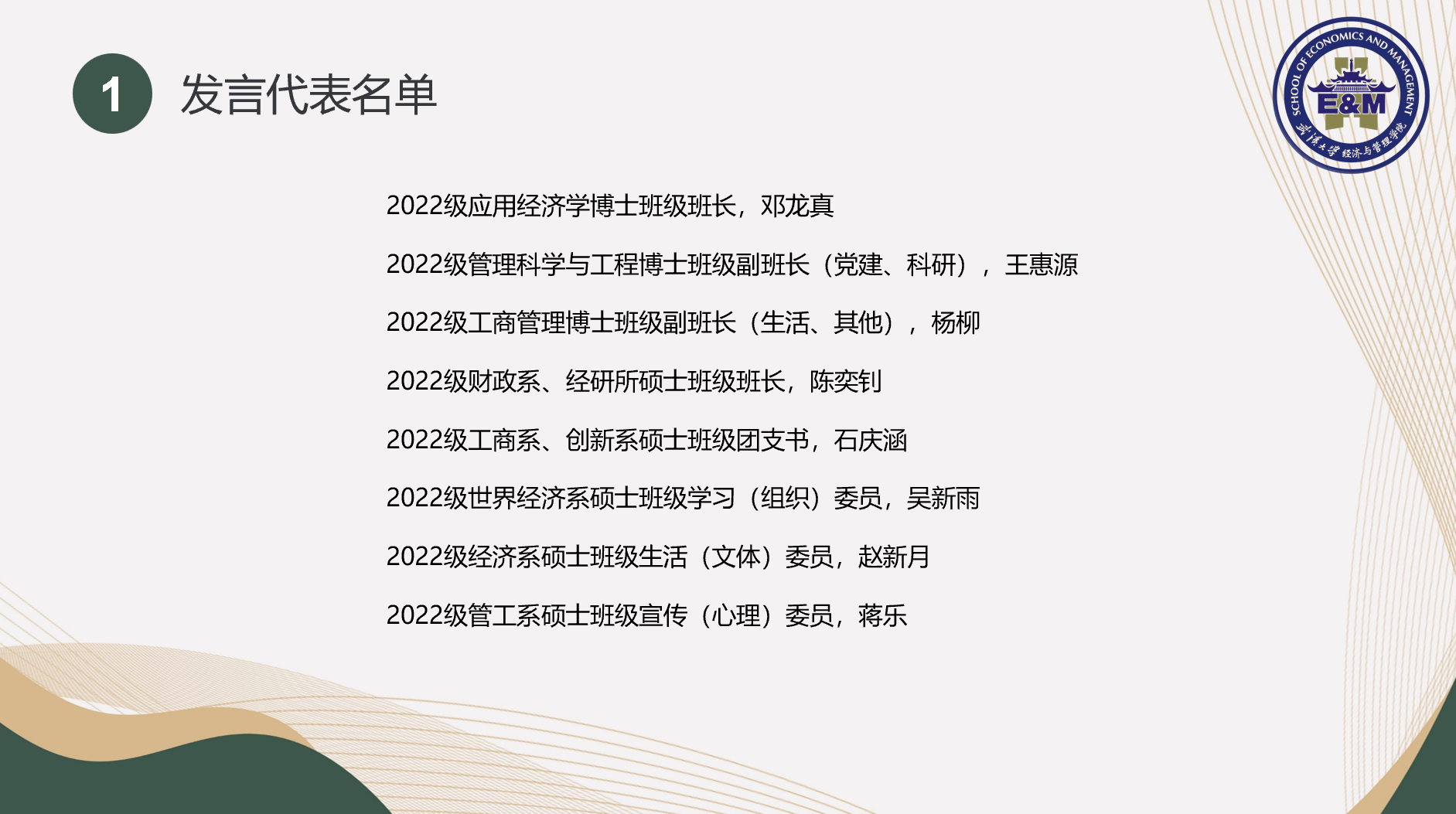 然后,各位班委代表踊跃发言。其中2022级应用经济学博士班班长邓龙真同学提出班委工作要牢记三个量:第一个是把握好提前量,预留出准备和容错的时间;第二个是精简信息量,接到通知后需要二次加工,把重要信息放在最醒目的地方;第三是尽量减少同学们的工作量,这也是班委服务同学的宗旨。各位代表从自己的角度出发,分享了各自在班级工作中的所见所感所思,对于班级工作的开展有丰富的借鉴意义。