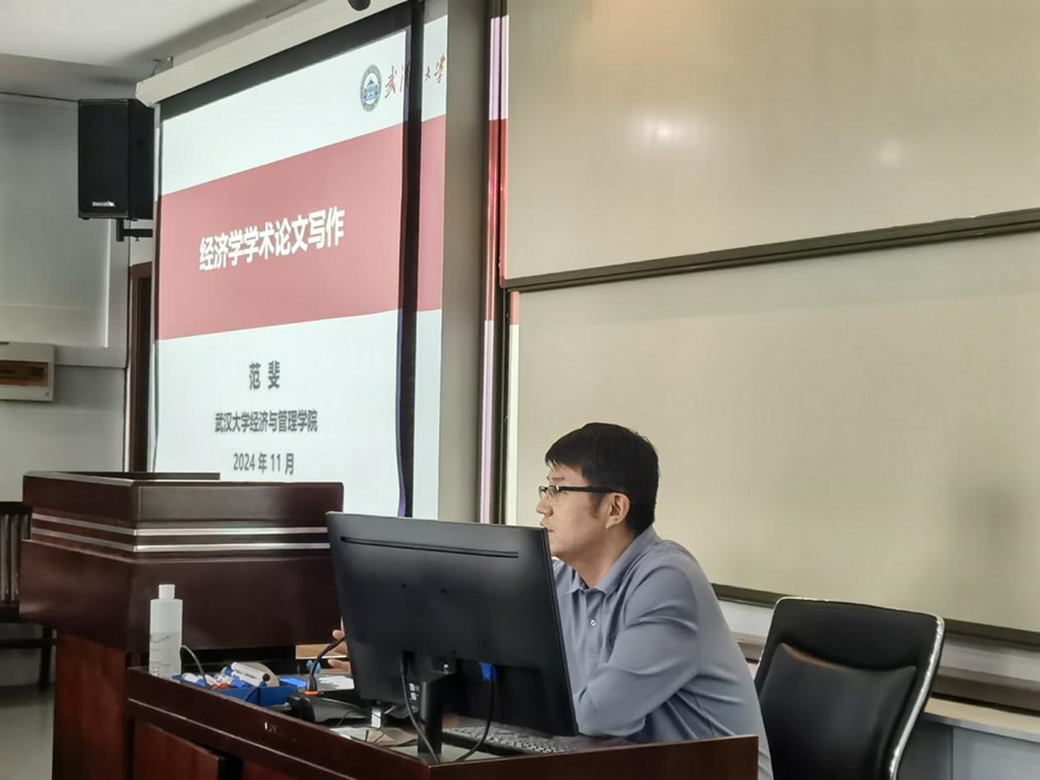 2024年11月1日,武汉大学范斐教授做题为“经济学学术论文写作”学术报告。范斐教授从选题确定,数据收集和研究方法,论文撰写注意事项,论文修改完善重点,中英文目标期刊选择,审稿意见回复这六大重要板块,深入浅出的讲解了一篇经济学学术论文的产生全过程,引发参会者关于学术论文写作方法的讨论,与会师生均深受启发、收获颇丰。