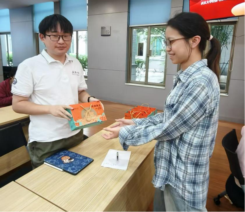 中秋佳节将至,为营造温馨和谐的节日氛围,活动在教师分享环节后特别安排了为全体研究生送上精心准备的“珞珈专属月饼”。小小月饼承载着武汉大学对同学们的深切关怀,让远离家乡的学子们在校园中感受到“家”的温暖,提升集体归属感和凝聚力;也激励着大家增强文化认同、汲取精神滋养,不断用新的奋斗书写新的篇章,让中华优秀传统文化,在代代相传中绵延不绝,在岁月流淌里守正创新。