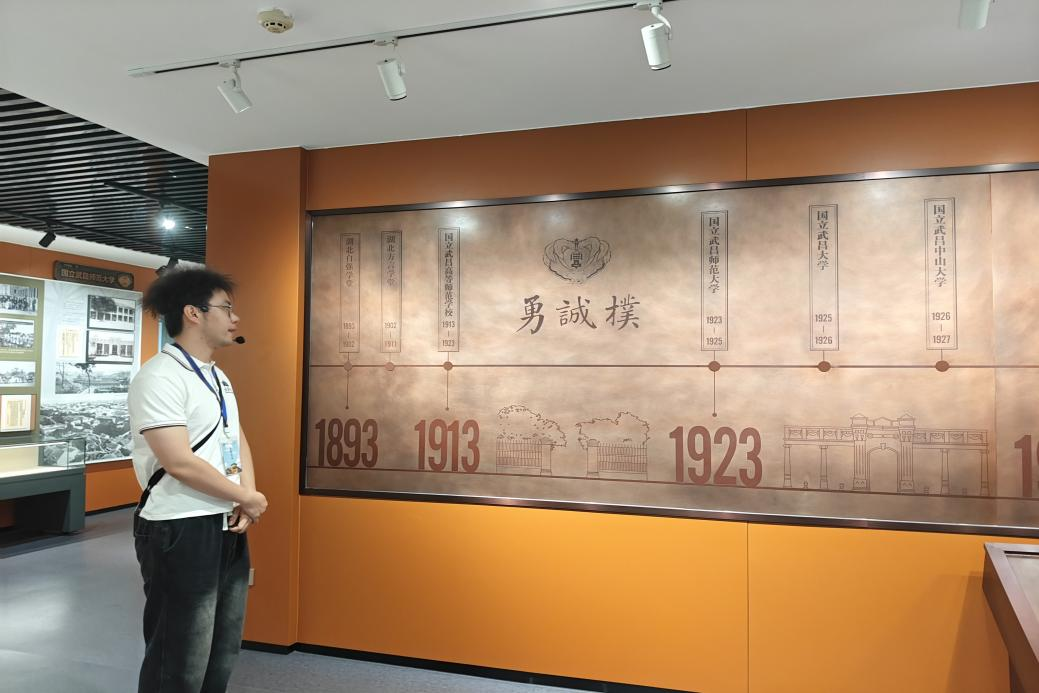 本次讲解工作由校史馆学生讲解员、同时也是支部成员的何承骋同志亲自担任。讲解过程中,他依托深厚的历史知识储备与专业的讲解素养,结合校史馆实物与图文资料,以清晰的逻辑脉络,将武大的历史故事生动呈现。他带领大家回溯了学校的选址、建筑和学科发展历史,还特别聚焦抗战时期西迁乐山的艰难岁月,讲述了师生在战火纷飞中坚持教学科研、以笔为枪投身救国的感人事迹。何承骋同志的深情讲述使在场成员如临其境,沉浸式地体悟那段峥嵘岁月。
