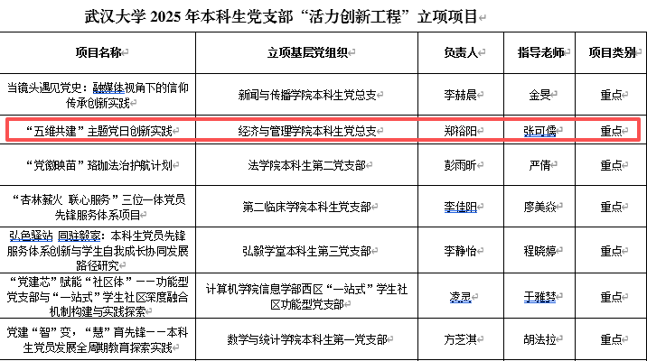 本科生党总支申报的《“五维共建”主题党日创新实践》获评重点项目立项,全校仅7个。