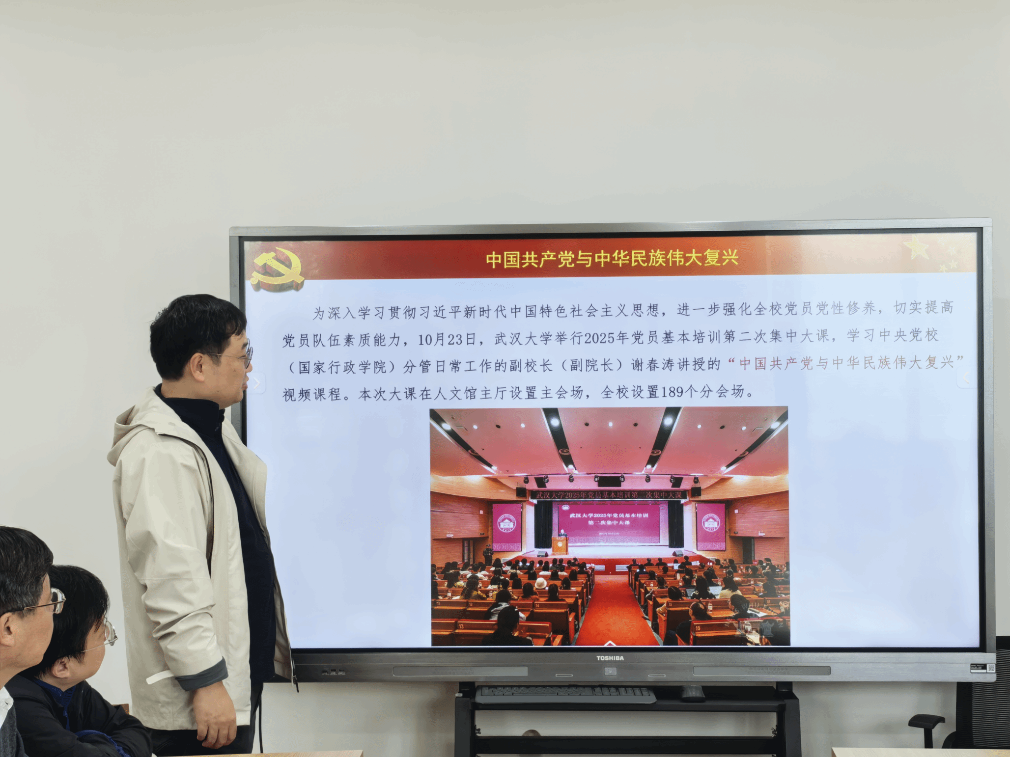 支部书记胡艺首先给支部党员回顾了中央党校(国家行政学院)副校长谢春涛同志主为第二次集中大课所讲授的《中国共产党和中华民族伟大复兴》课程的主要内容,他以中华民族伟大复兴为主题主线,从夺取新民主主义革命伟大胜利、完成社会主义革命和推进社会主义建设、进行改革开放和社会主义现代化建设、开创中国特色社会主义新时代四个历史阶段回顾总结了党的百年奋斗重大成就和历史经验,特别是重点讲解了党的十八大以来,在以习近平同志为核心的党中央坚强领导下,党和国家事业所取得的伟大历史性成就。随后,胡艺还传达了武汉大学党委书记朱孔军对全校师生提出的三点学习要求。一是要筑牢信仰之基,从百年党史中汲取复兴伟力;二是砥砺奋进之志,在实干担当中赓续红色血脉;三是胸怀“国之大者”,在服务国家大事业中推动高质量发展。