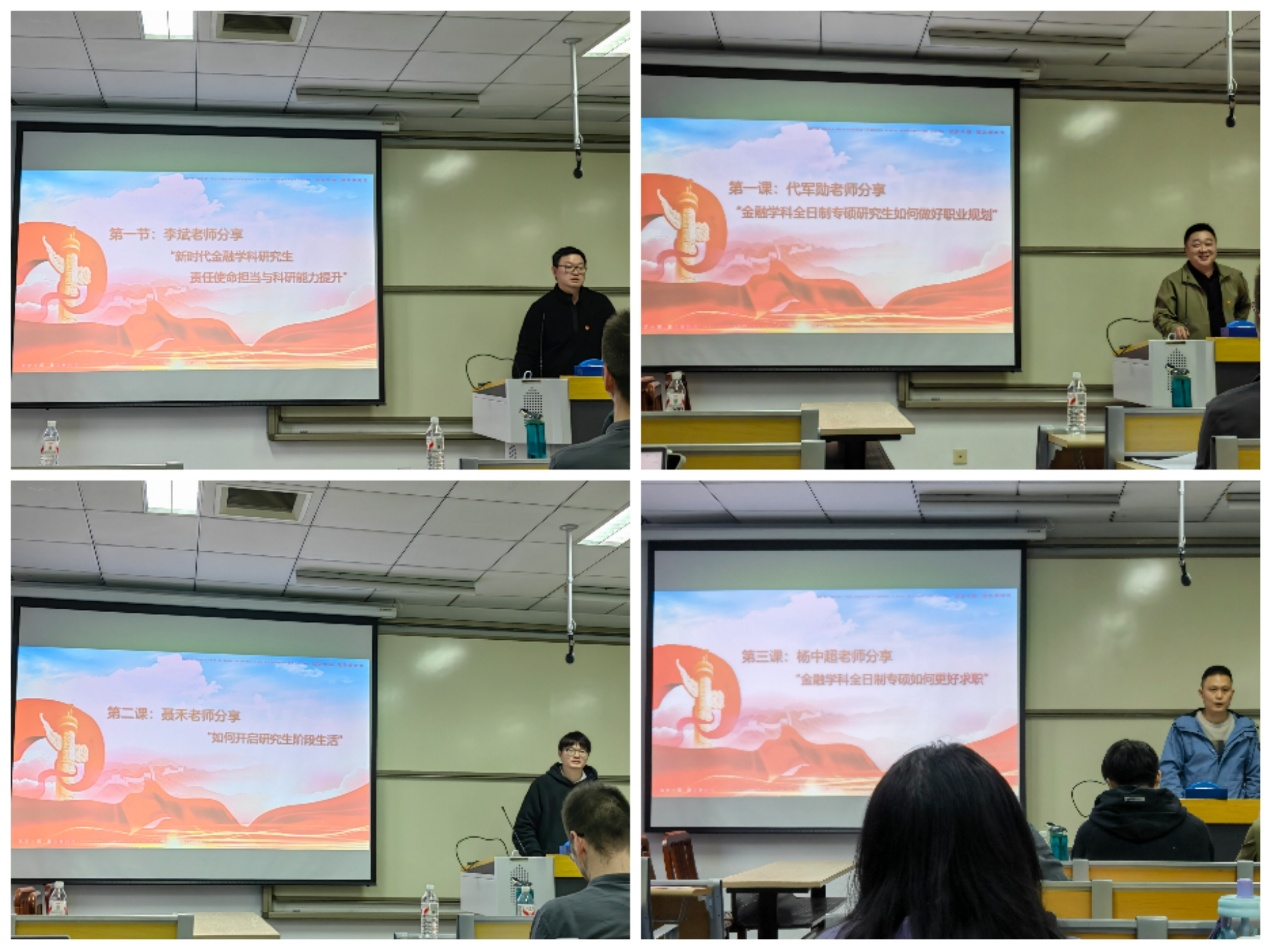 李斌以“新时代金融学科研究生责任使命担当与科研能力提升”为题,强调新时代金融人才应胸怀“国之大者”,立足国家战略需求,在服务实体经济中践行使命,在夯实科研能力中践行专业报国理想;代军勋聚焦“金融学科全日制专硕研究生如何做好职业规划”,引导学生辩证看待冷门与热门岗位,统筹短期选择与长期发展,平衡学习深耕与实习实践,在能力与人脉的共同建设中实现志存高远的职业追求;聂禾围绕“如何开启研究生阶段生活”,进一步阐释课堂学习与长远发展的内在联系,帮助同学们树立正确的学业发展观;杨中超系统梳理“金融学科全日制专硕如何更好求职”,从行业认知、能力构建到求职节奏进行全面指导,强调既要练好研究分析、数据处理、沟通协作等基本功,又要把握求职时间脉络,更要将个人发展融入国家战略布局,在时代浪潮中锚定价值坐标。四位教师党员立足学科特色与育人使命,为同学们的成长发展注入思想引领力量。
