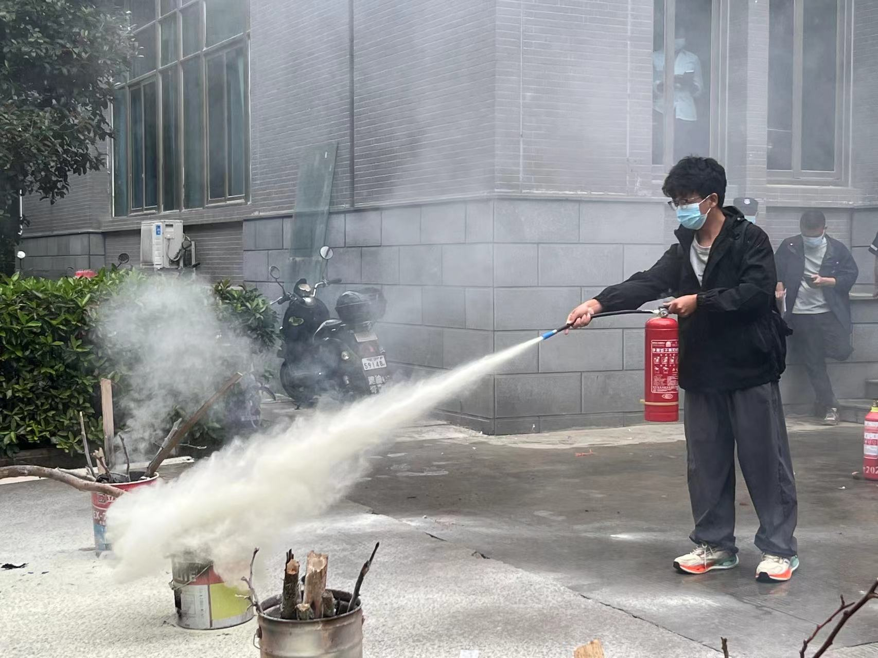 在实操环节,老师和同学们纷纷上前体验,亲手完成从“拔销、握压、扫射”到“扑灭火源”的完整操作流程。伴随着喷射出的白雾,现场火源迅速被扑灭,大家在亲身体验中加深了对灭火器操作规范的理解,也切身感受到了“早发现、快反应、会操作”的重要性。